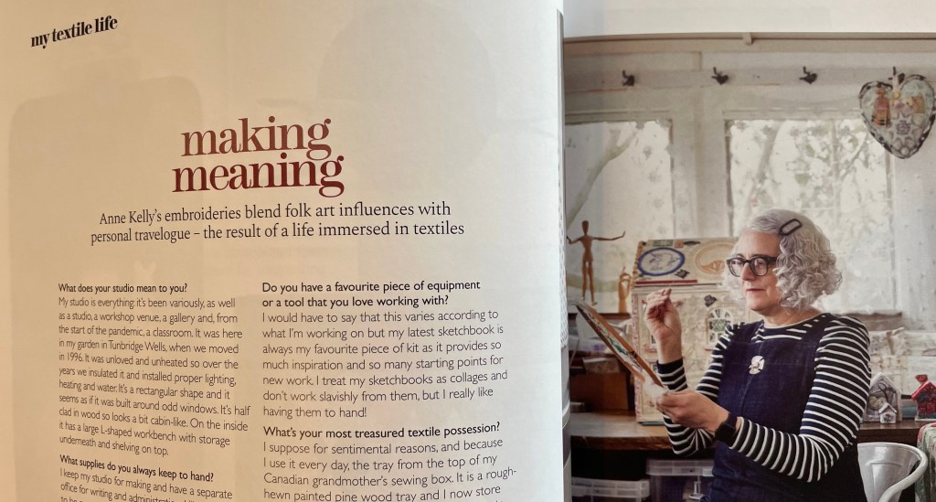 I was delighted to be photographed in my studio by renowned photographer Alun Callender in March, and very pleased that some of the shoot is featured in the current edition of ‘Embroidery’ magazine. The interview is about my practice and current events.