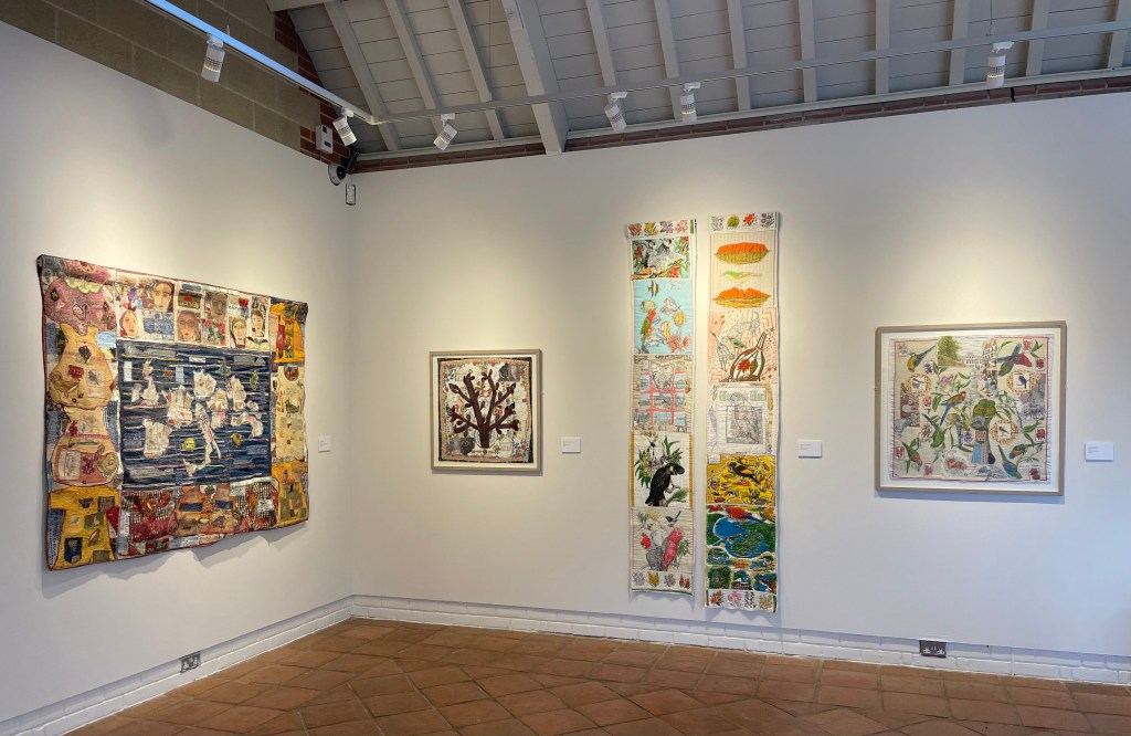 There are also a number of framed and unframed embroideries including ‘Europeans’, ‘World Bird Tree’, ‘Stay at Home’ and a new piece ‘Amazon Bird Tree’.