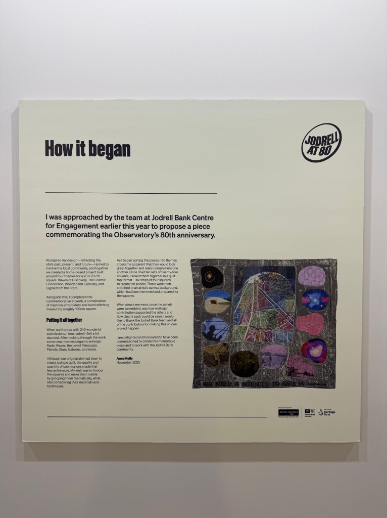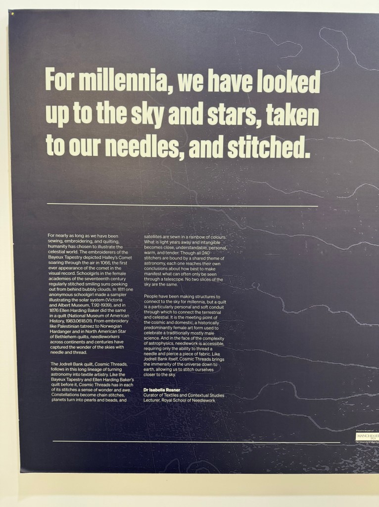 I would like to thank Emma Pemberton-Eccles, Lauren Trim of the outreach team and Profs Teresa Anderson and Tim O’Brien for their support throughout this extraordinary project.https://www.jodrellbank.net/events/cosmic-threads-community-quilt-exhibition/