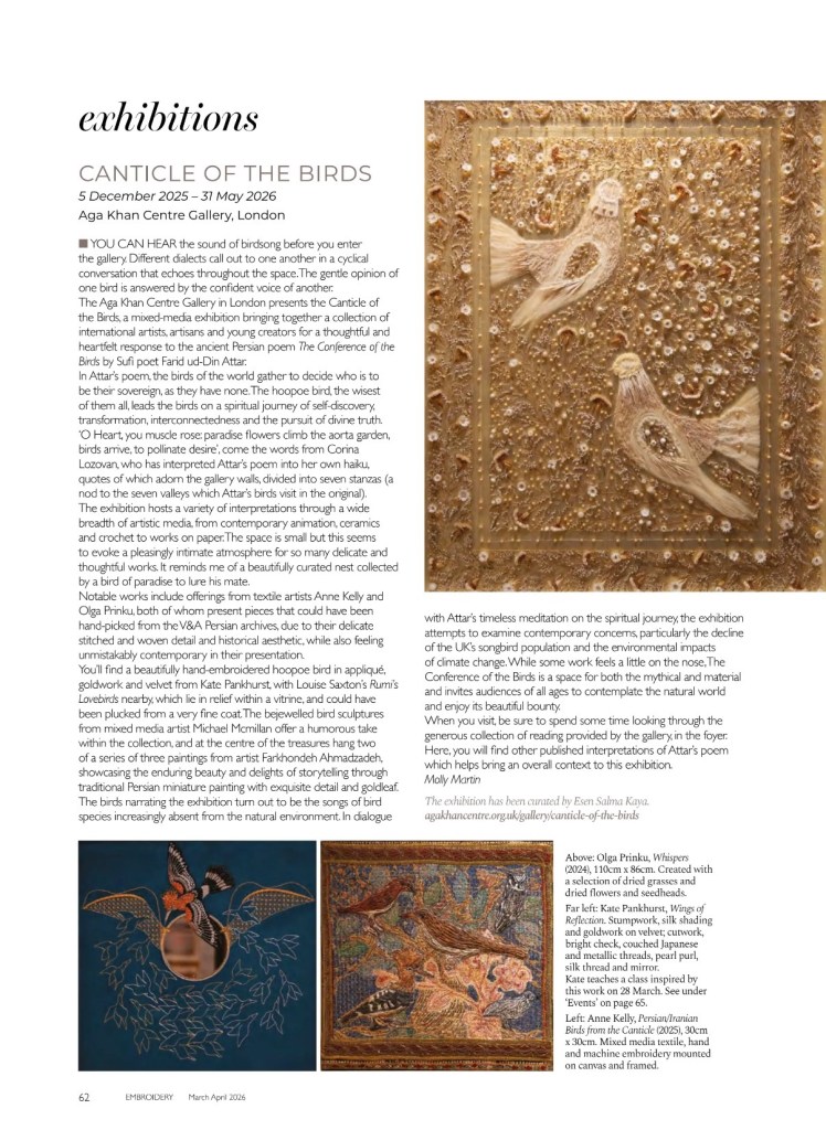 Lovely review of ‘The Canticle of the Birds’ in March/April ‘Embroidery’ magazine by Molly Martin.