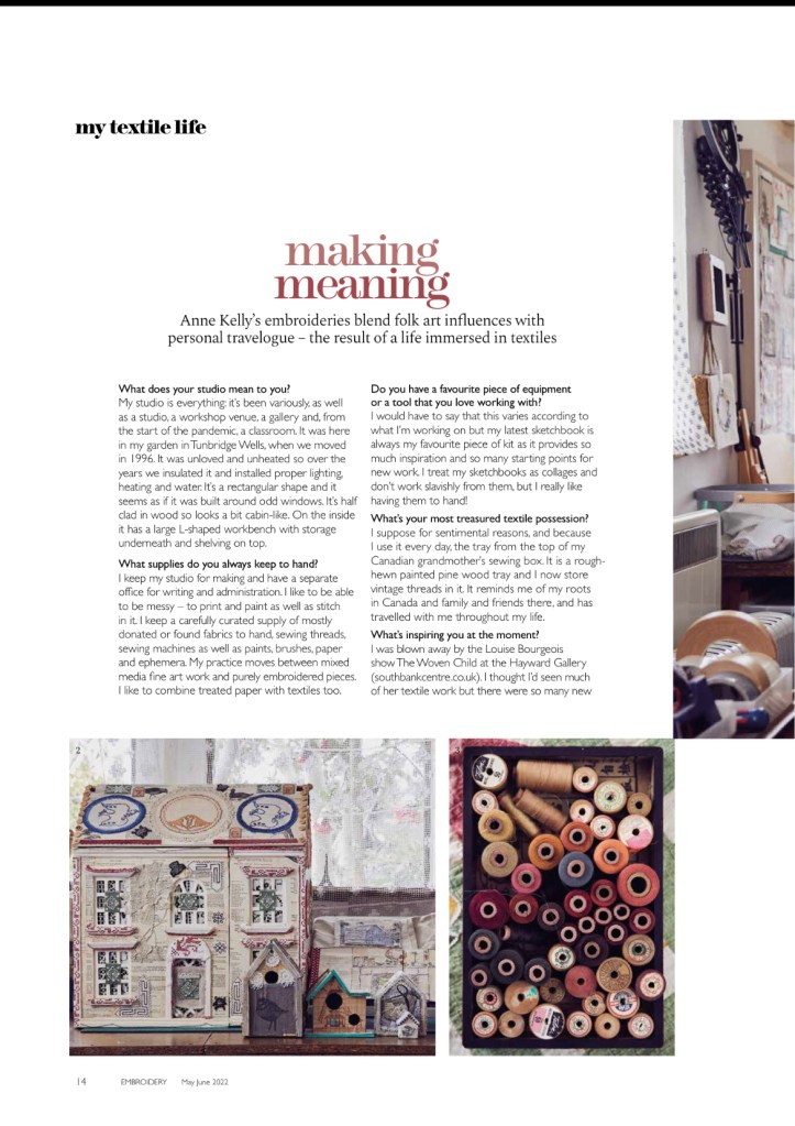 A feature courtesy of Jo Hall in the May/June 2022 edition of Embroidery Magazine ‘My Textile Life’, on my studio and practice, with photos by Alun Callender.